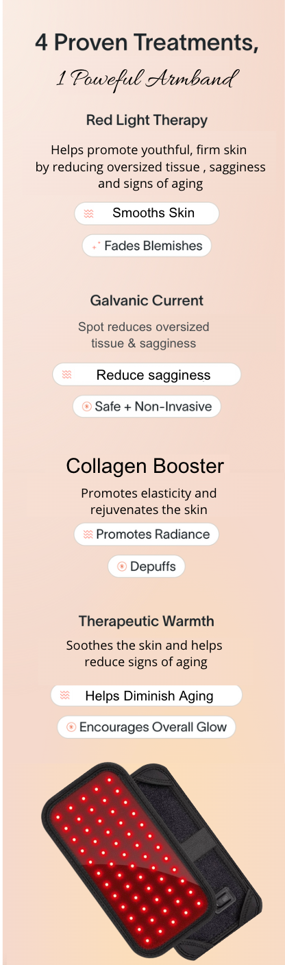 The Arm armband is the marvel we've all desired. It boasts Red Light Therapy for deep rejuvenation, Galvanic Current to reduce sagginess , Vibrating Massage to combat puffiness and promote elasticity, and Therapeutic Warmth to reduce signs of aging. Once tried, it becomes an indispensable ally.