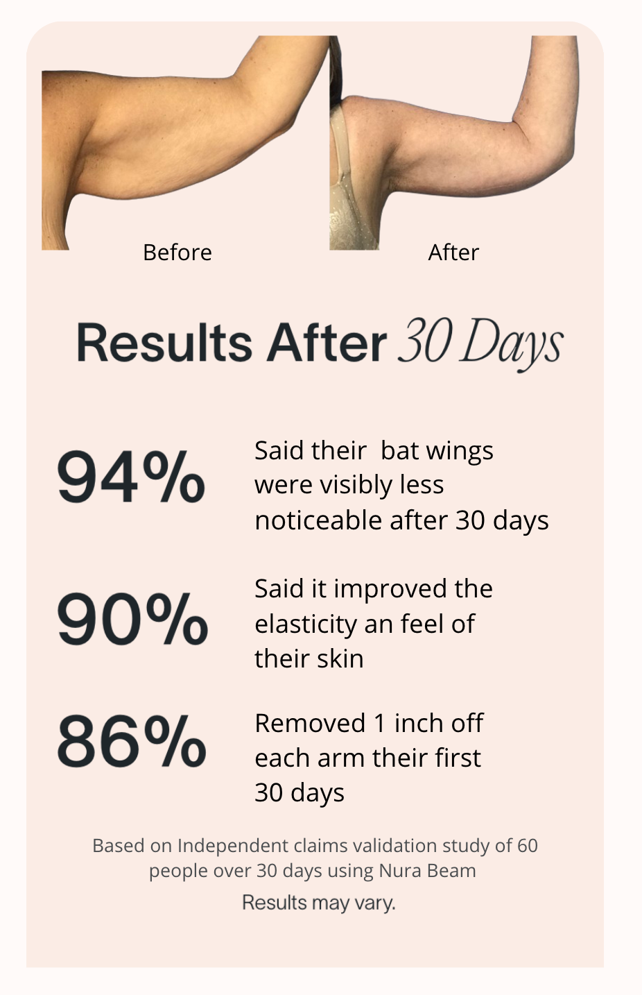 The NuraBeam Arm Bands are completely non-invasive, painless, and safe for daily use. Unlike surgery or harsh treatments, it uses gentle red light therapy that has been clinically studied for skin tightening and body sculpting. Most customers experience only positive effects — a firmer, smoother arms and improved skin tone. No downtime, no irritation, just natural results.